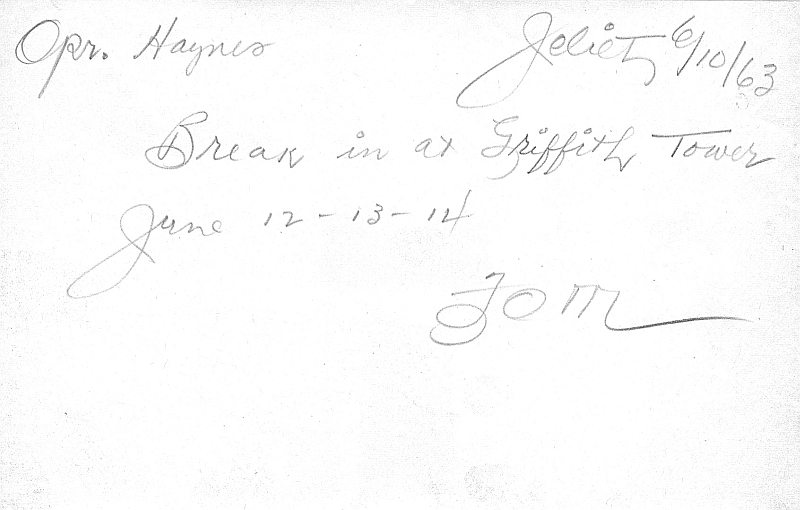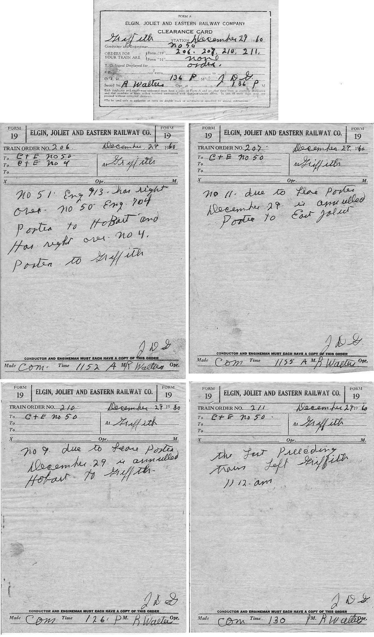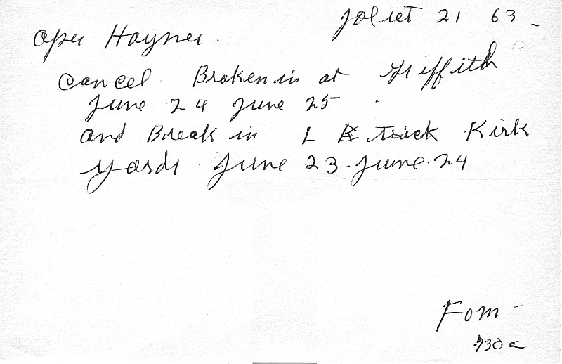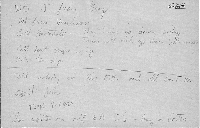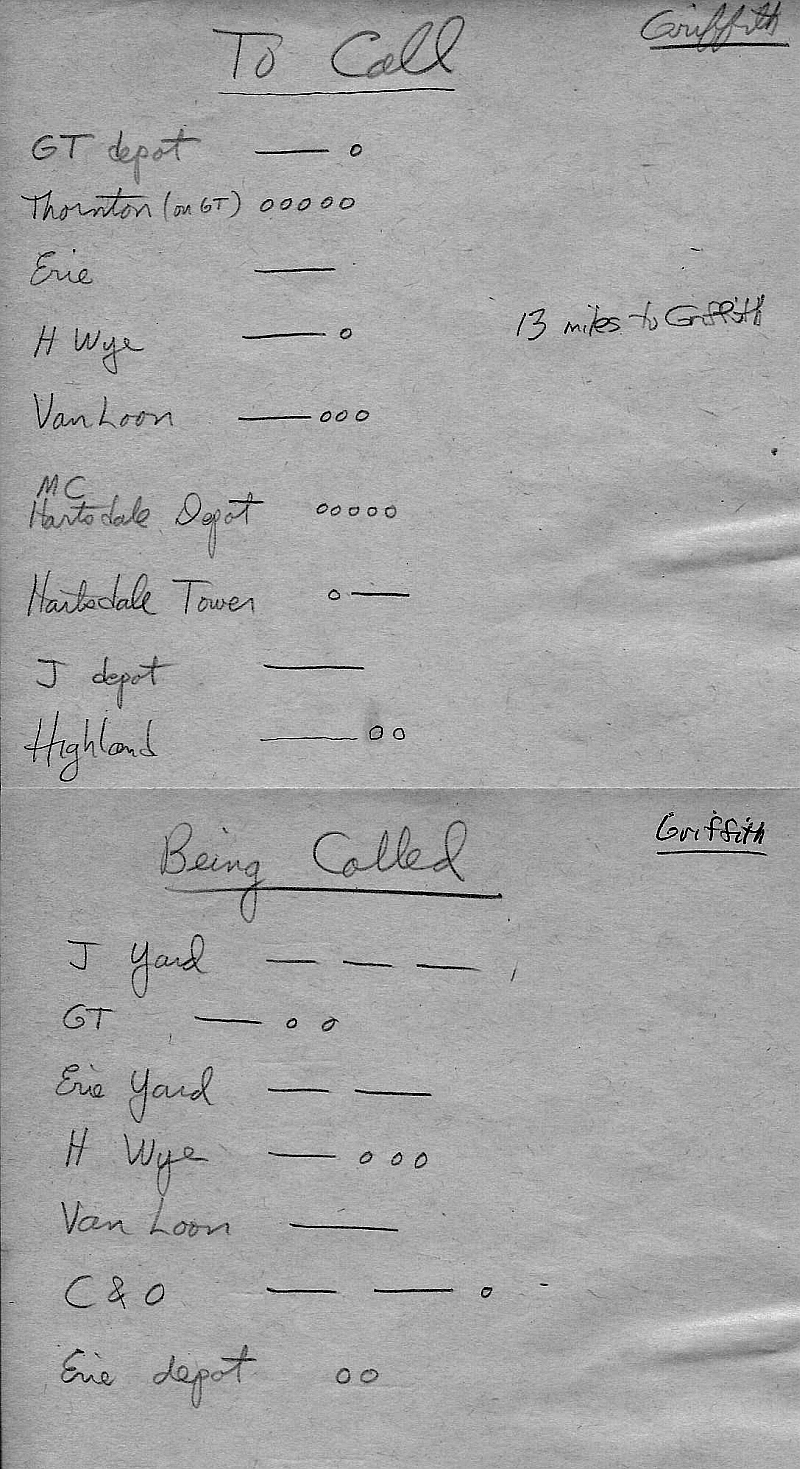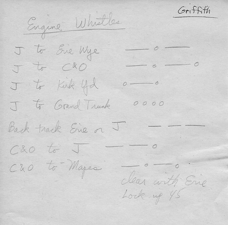 Interlocking Diagram What can you say about Griffith tower? For me it was an operator's dream come true to be able to work an interlocking with five railroads (EJ&E, EL, C&O, GTW, and MC) and 22 diamonds (count 'em) This had to be the biggest and most complex interlocking on the J. It had everything: Passenger trains on two railroads, many freight trains, through traffic and lots of interchange movements. Five years earlier I made my first visit to Griffith tower. Although physically similar (brick construction), it was different from other J towers I had visited. It had a pistol-grip lever machine (other J towers I had visited had "armstrong" levers). Its five railroads kept the operator busy. One other thing which stood out was the tower operator had to manually operate the Broad Street crossing gates. Broad Street (Griffith's main street) ran north and south right through the middle of the interlocking. There were nine tracks between the gates. It was possible for four of them to have trains at the same time. Several of the Griffith diamonds were within Broad Street and its sidewalks. That must have been a maintenance headache. I'm guessing the two gates were about two hundred feet apart. Thus it was not unusual for automobiles to become "trapped" between the downed gates. Fortunately, there was enough space between several of the tracks to allow an automobile to safely sit and wait for the train(s) to pass. Also, during the day there was a crossing watchman on duty to assure the safety of any cars or pedestrians trapped between the gates. Operation of the gates was a responsibility I'm sure the operators did not like. I know it made me nervous. Once one or more lineups were made, the operator had to be very aware of the location of the approaching train(s). One dared not answer the phone to copy a train order, for example. This June 10th message ordered me to break in at Griffith on June 12, 13, and 14. When a message did not specify a trick, I would pick my own work hours, with the goal of all three tricks in case there were different responsibilities. On June 12 I chose to break in on 1st trick with old-timer Ruth Walters. I had been told earlier that he had been there "forever" and was about to retire. Ruth was very good and helpful in teaching me the job. The second day I chose 2nd trick for break in. My third day I was diverted to work at Waukegan, one of several short notice plan changes during the summer. This June 18th message instructed me to break in at Griffith four more days but specifically on 2nd and 3rd tricks. Just to show again how things constantly changed, I got in two days before this June 21st message instructed me to break in and work at Kirk Yard. As usual I took notes. As I review these notes 53 years later, it's clear that they did not cover all situations for all railroads. Apparently I wrote down only those things involving steps I may not have easily remembered. At Griffith the C&O, J, GTW, and Erie had manned depots. I remember the C&O and GTW agent-operator person would call me about appoaching trains. They apparently handled their own train orders and reporting of trains to their dispatchers. MC had a depot at Hartsdale. That's likely where I got information on approaching MC trains as there was no communication with the MC dispatcher. [Former Griffith resident Leonard Keen worked as a clerk in the joint Erie / C&O operation in Griffith and writes, "The GTW agent / operator received and delivered their railroad train orders and os’ed their trains to their dispatchers. The Erie / C&O joint agent / operator also received and delivered their railroad train orders and os’ed their trains to their respective dispatchers."] Speaking of train orders, Griffith had a train order stand for eastbound movements. Not all trains got orders. Here is a clearance and four orders issued to No. 50 on the Porter line. I acquired these, dated December 29, 1960, during break in time. Here is a list of 2nd trick passenger trains. Unfortunately, I do not have lists for 1st and 3rd tricks. Here is a list of phones used at Griffith. As stated in the Introduction page, telephones at any tower could be a challenge to learn. Griffith was no exception and it turns out I wasn't taught much on how to know who was calling by recognizing the ring tone. Here is a list of engine whistles. With no radios back then, the trains would use their whistles to tell the operator where they wanted to go. One always remembers the things which didn't go quite right.