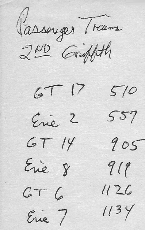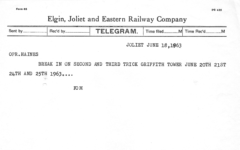 I regret not keeping a list of trains but it might have been difficult at times with the multiple moves and responsibility of operating the gates. The only trains recorded in the tower on a train sheet were the EJ&E trains. For the other railroads I believe recording of trains, OS'ing of trains, train orders, etc. were handled through the depots. During the summer I spent four break in and five working days at Griffith tower. I had a great time and wish it could have been much longer but it got cut short as I had to return to school.