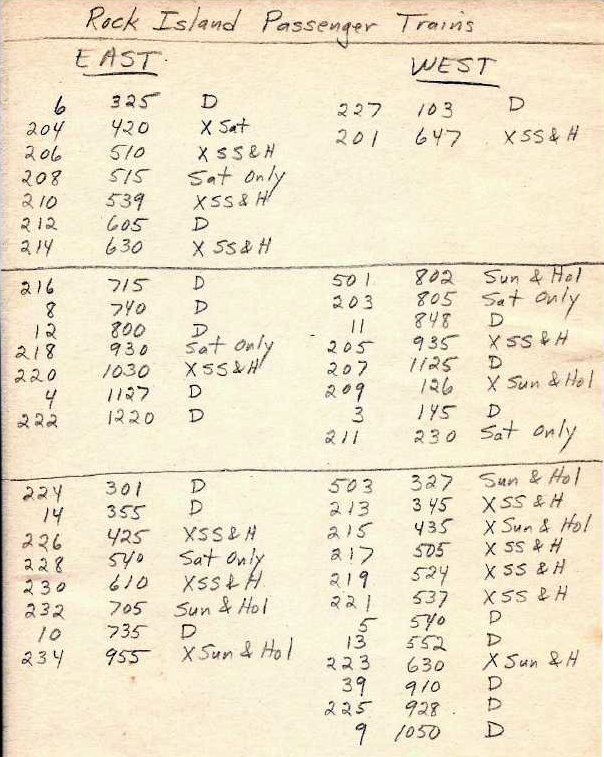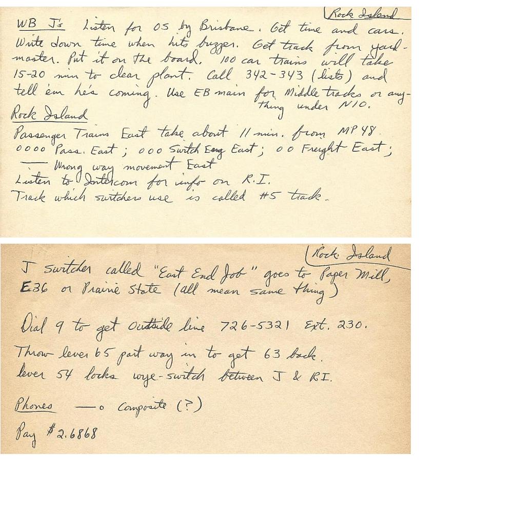 Interlocking Diagram My Rock Island Tower experience at Joliet began with this message received while working at Ivanhoe. Since I had never been to Rock Island tower, I asked an operator at Ivanhoe for directions. He wrote these driving instructions. I followed this route each workday as I chose to drive Hobart to Joliet and back. The J would pay driving mileage only for the first and last day worked, i.e. one round trip from my home base (Hobart, IN) to a job, no matter how long that job lasted. The J paid 7.5 cents per mile in 1963. So, since the distance between Hobart and Joliet is about 50 miles, I got paid a whopping $7.50 mileage for all those trips. Gosoline cost about 30 cents per gallon. There was no mileage paid for break in days. My first break in day got off to a bad start. The message made it clear that I would be working 2nd trick but that first day I had a personal problem. My parents were returning from a vacation in California and I was supposed to pick them up at Chicago's Midway Airport in the early evening. So I decided to do the first break in day on 1st trick and then go to Midway after work. I walked into Rock Island tower, introduced myself, and said I was there for break in. I don't remember the operator's name but he told me he would not do it because he didn't get paid enough for breaking someone in and I should return for 2nd trick. I said "Okay, but I want to make a diagram of the plant before I leave." I made the diagram and left the tower. I then called a friend in Hobart and he agreed to pick up my parents at Midway. I spent the day in Joliet in my car familiarizing myself with the Rock Island plant diagram. I then returned to the tower for 2nd trick break in. Made for a long day! By the way, I interacted with that first trick operator several times in the next two weeks and we got along fine. No hard feelings. I guess technically he was correct to refuse the break in. I never did learn what extra pay an operator got for breaking in a new operator but the base pay at Rock Island tower was $2.6868/hour. Here are the two pages of notes I took when learning the job. Included was getting a track for inbound J trains and then displaying that information to the crew. Remember, there was no train communication radios then. The inbound track number was displayed outside the tower and was lighted at night. The primary objective was to move J trains in and out of the yard while avoiding delays to the Rock Island passenger and commuter trains. J trains and RI freights had equal priority. This Rock Island passenger train schedule lists all 3rd trick (11pm to 7am), 1st trick (7am to 3pm), and 2nd trick (3pm to 11pm) trains. The 200 and 500 series trains were commuter trains, the others long distance. There was an intercom, I recall, between Rock Island tower and MC tower close by to the west and maybe UD tower too although I don't remember ever talking to UD. Since J trains entering or leaving East Joliet Yard were traveling slowly, one had to be very conscious of the Rock Island passenger schedules. As the notes indicate a 100-car J train could take 15-20 minutes to clear the plant. The only delay I recall was when a J train entering the yard experienced a minor derailment which resulted in sticking a couple of westbound commuter trains. I recall being criticized by MC for not reporting the problem to the RI in a timely manner. Speaking of MC tower, here's a photograph showing MC tower where the Michigan Central Joliet to East Gary line crossed the Rock Island. If you look carefully in the background of the left-side 1/3 of the photo, you can see Rock Island tower, just a short distance away. Here's my MC tower diagram. During break in I was made aware of a certain sequence of legitimate lever throws which might lock up the plant. A crank had to be applied at a specific point in the locking bed to free things up. I forgot about this until it actually happened one night. I had to make a call to the maintainer to refresh my memory as to what to do. This incident reminds me of the 20-80 rule which states that 80% of one's training should concentrate on the 20% of things which can go wrong while 20% of training should be adequate for the normal good stuff. In my tower break in experience the bad stuff was rarely mentioned.