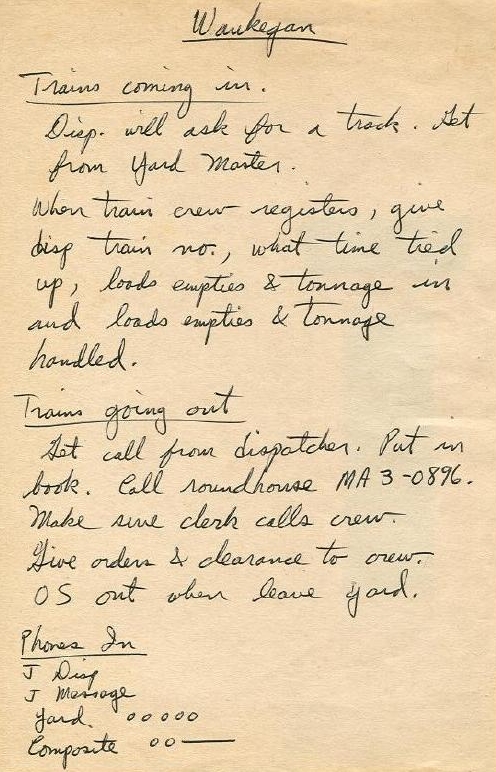 I should warn you that this section will be short and pretty much uneventful but the experience was unique for me. That's because I worked the Waukegan, Illinois, job for just one second trick without any break in experience. I was sitting at home the morning of June 14, fully expecting my third day of break in at Griffith, and the phone rang. Somebody from the dispatcher's office called to say they needed someone to work second trick at Waukegan that afternoon (no reason was given and I never did learn why) and would I be willing to do it. Since I had almost no knowledge of the Western Sub, had never been to Waukegan in my life, needed the money for college, and wanted to try new things, I said, "Sure, I'll do it!" Maybe stupid, maybe not... time would tell. I don't remember the details of the route I took to drive there (remember, there were few expressways back then), but I did manage to arrive an hour early to pick the brains of the first trick operator in order to learn what I could about the job duties. Waukegan is the railroad western and physical northern end of the EJ&E. It had a yard, roundhouse, and crew building (and other buildings but I never got a tour of what was there), the kind of things one would expect at the end of a railroad. The building I went to appeared to be the yard office (or perhaps a crew office). It had a crew register book and standard clock. This was not an interlocking tower. There were no levers, no switches, and no signals to operate. I just sat at a desk in an office. When I arrived to talk to the first trick operator, the first thing he gave me was this message which made things official. One thing which stood out were the last three words of the message... "until further notice". Although the words looked like they were crossed out, that was not the case. That's just the fancy way the operator crossed the T's. The duration of the job was never discussed on the phone call earlier in the day but the message made it clear it might be more than one day. Since Waukegan is roughly 200 miles round trip from Hobart (with Chicago in between!), I began to wonder if I would have to find a place to stay in Waukegan or would I drive from home every day. I found out later in the shift that the job was for just one day. Whew! Besides, I would rather work in an interlocking tower, not just sit at a desk. I couldn't even see the trains that arrived and departed from Waukegan. I talked to the operator and took these notes about the job. As you can see, the job involved working with the dispatcher, crew caller, yardmaster, roundhouse foreman, and train crews. The only "tower operator" duties that I was familiar with were the train orders and clearance forms for outgoing trains. I made it through second trick okay, given that I had minimal break in. I recall there were two trains in and one out, but may have been more. Unfortunately, I did not record the train activity.