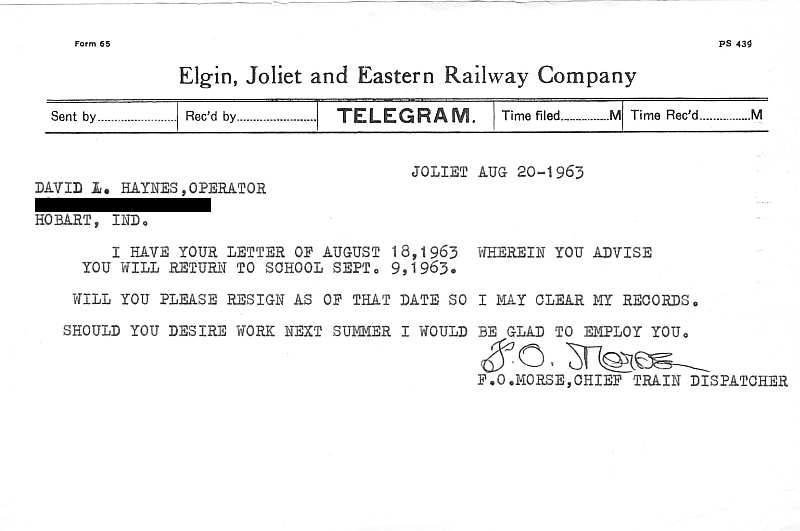 - In August it was time to notify Chief Dispatcher Morse that I would be returning to school.